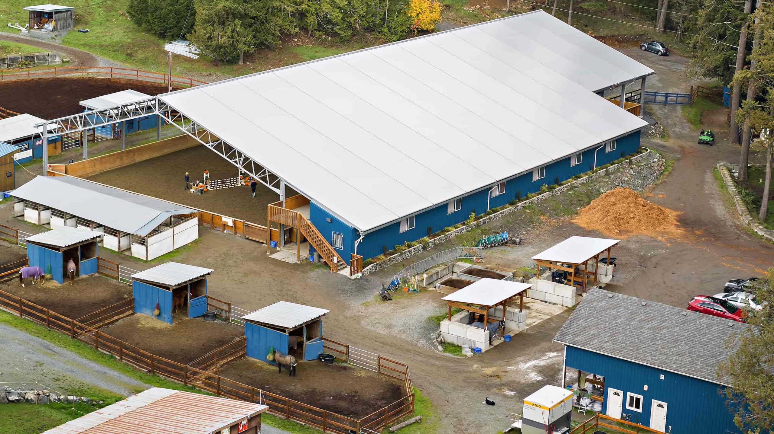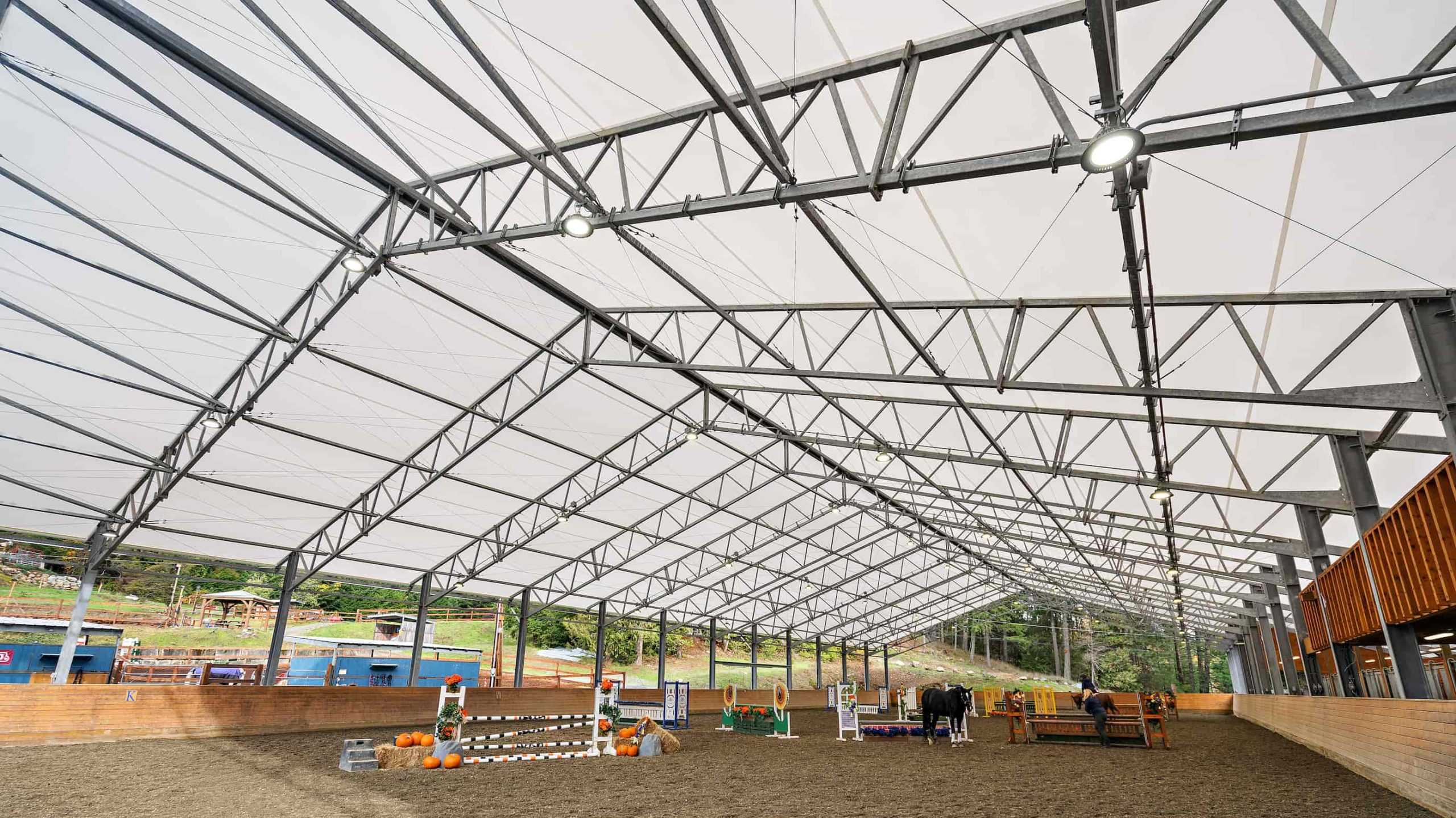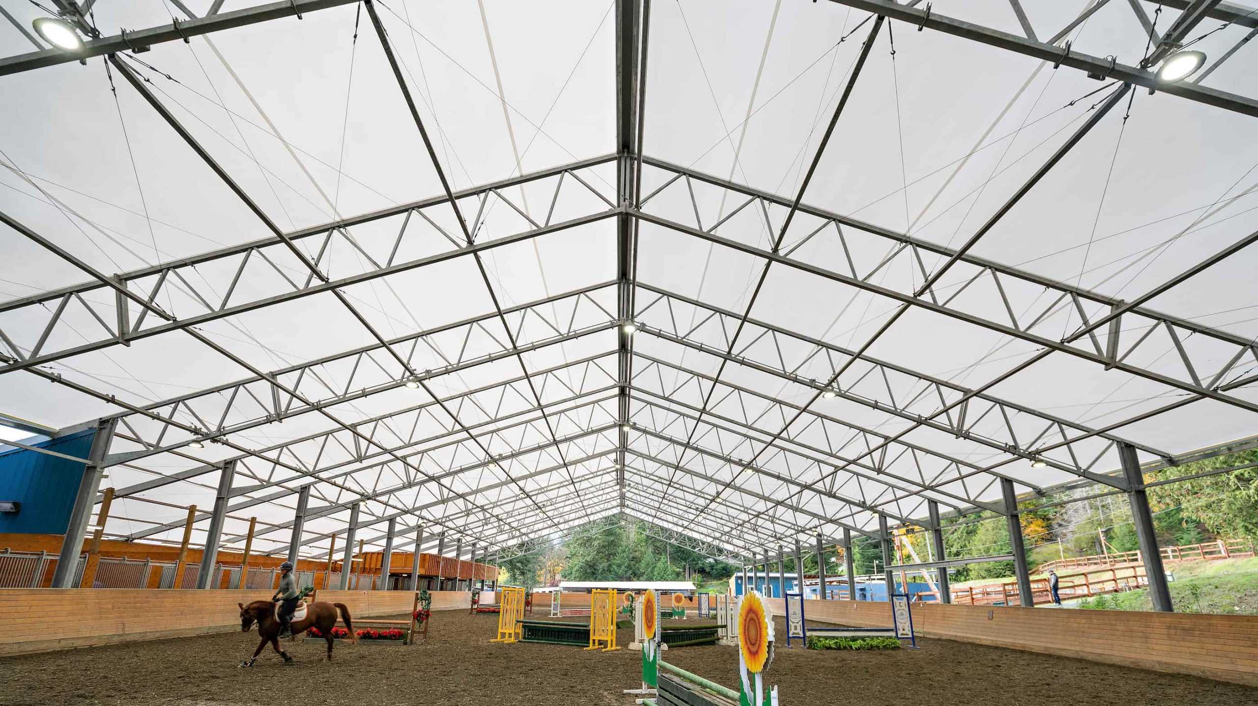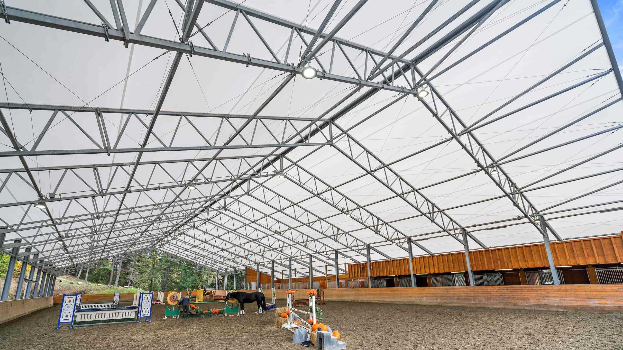 90’ X 208’ FABRIC ROOF RIDING ARENA WITH 24' x 168' STABLE WING